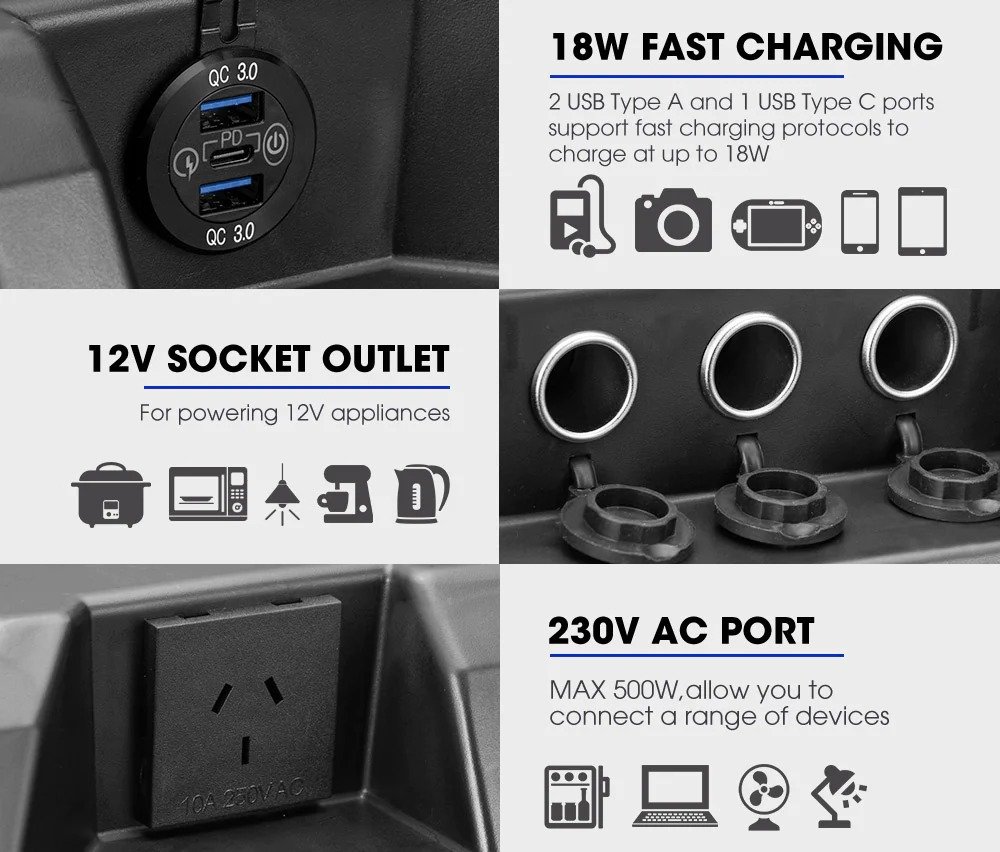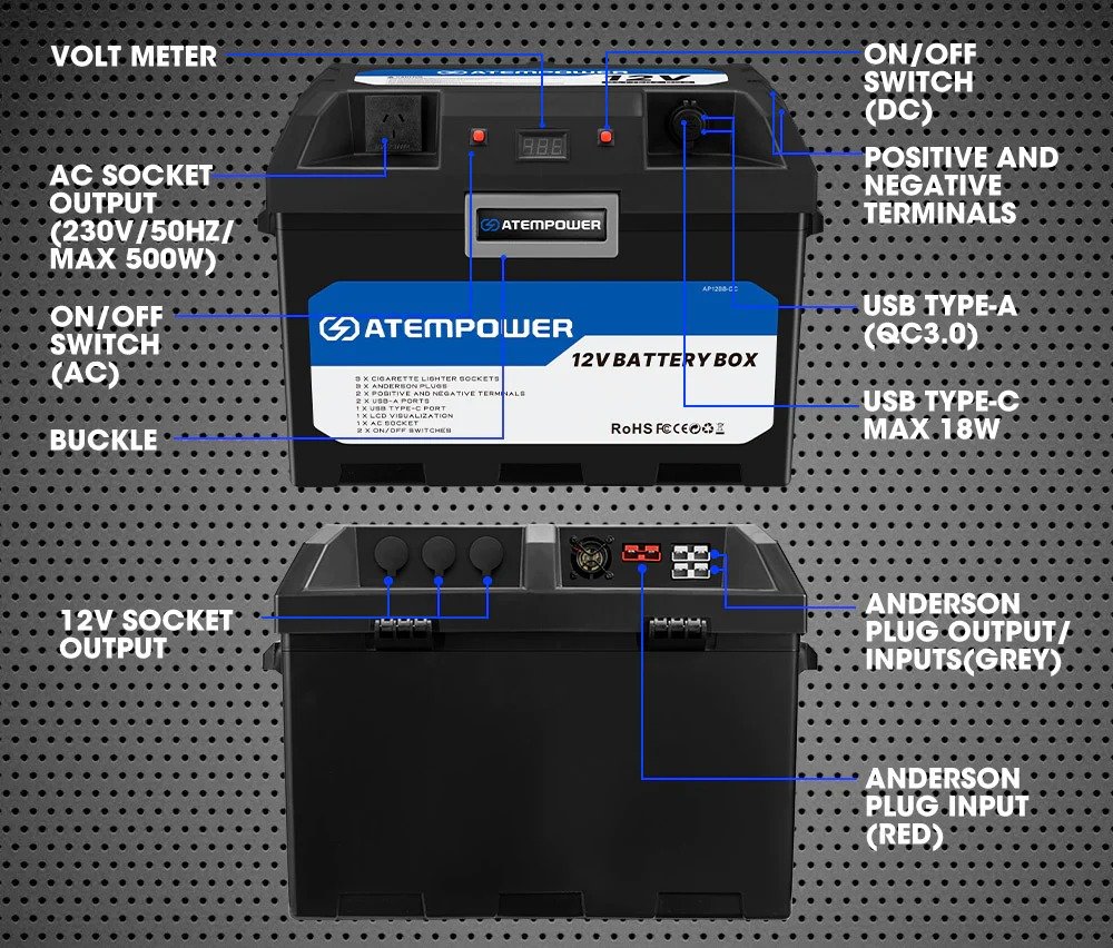 Funcionalidad versátil: con esta caja de batería de 12 V, puede alimentar electrodomésticos de 230 V, luces de campamento, refrigeradores, cargar teléfonos, tabletas y mucho más.