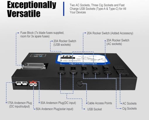 • Enchufes múltiples: Nuestra caja de control de 12 V incluye dos tomas de CA, tres tomas de cig y tomas USB (Tipo-A y Tipo-C), lo que garantiza la compatibilidad con una amplia gama de dispositivos.