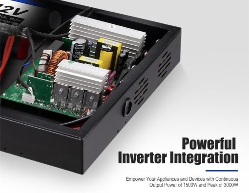 • Inversor integrado: Nuestro centro de control de 12 V cuenta con un inversor integrado con una potencia de salida continua de 1500 W, lo que le permite alimentar varios aparatos y dispositivos.