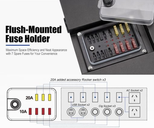 • Interruptores precableados: Nuestra caja de control de 12 V viene precableado con fusibles de alimentación, proporcionando un control sin complicaciones sobre los dispositivos conectados y los accesorios añadidos.