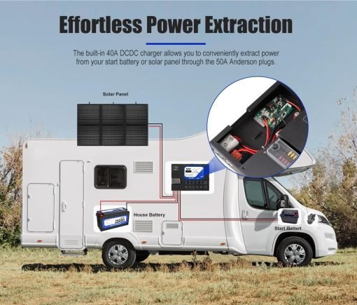 • Smart Power Hub: El cargador DCDC de 40 A incorporado le permite extraer cómodamente la energía de su batería de arranque o panel solar a través de los enchufes Anderson de 50 A.