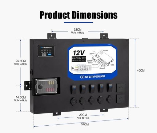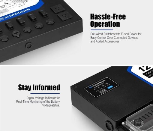 • Gestión inteligente de la energía: Nuestra caja de control de 12 V permite un cómodo control y distribución a sus dispositivos, proporcionando una flexibilidad inigualable en su configuración eléctrica de 12 V.