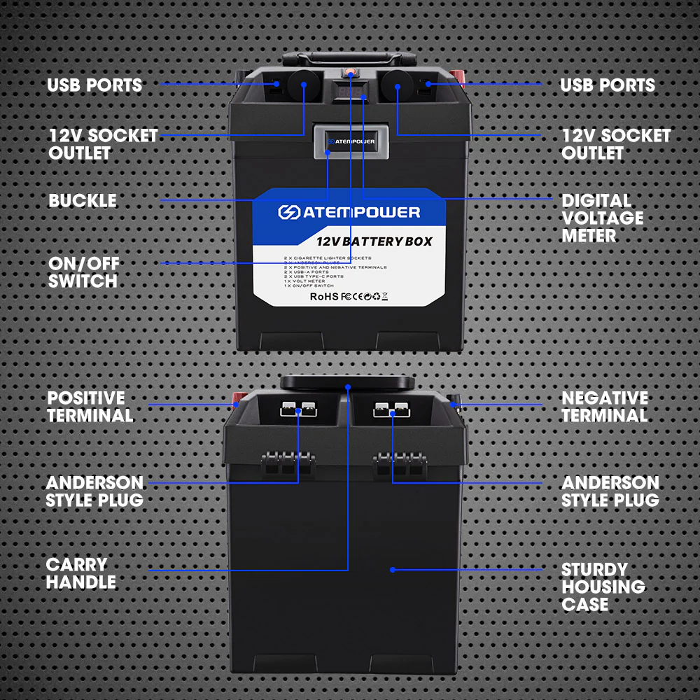•Funcionalidad versátil: esta caja de baterías ATEM POWER es ideal para vehículos 4×4, embarcaciones pequeñas, paneles solares, dispositivos electrónicos, luces de campamento y refrigeradores.