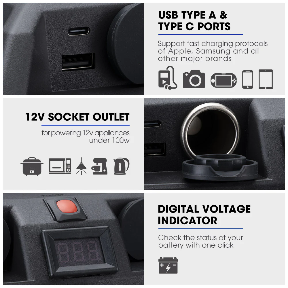 •Múltiples tomas de corriente: la energía se suministra a través de 2 tomas de encendedor de cigarrillos, 2 puertos USB tipo A, 2 puertos USB tipo C y 2 enchufes Anderson.