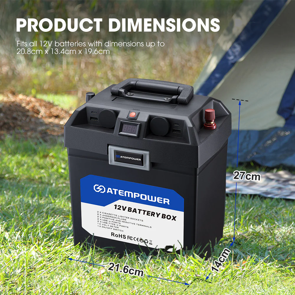 •Montaje universal: esta caja de baterías se adapta a todas las baterías de 12 V con dimensiones de hasta 8,19 pulgadas de largo (20,8 cm) x 5,28 pulgadas de ancho (13,4 cm) x 7,72 pulgadas de alto (19,6 cm).