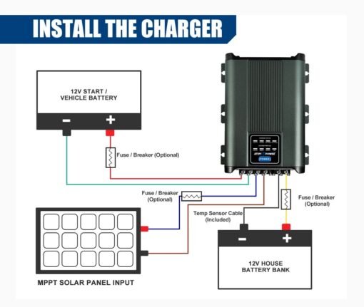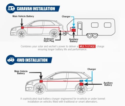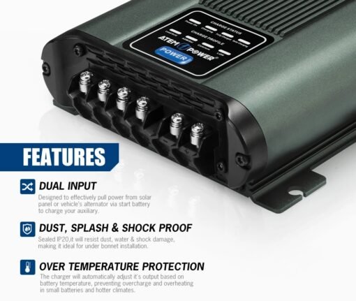 • Entrada dual: este cargador está diseñado para extraer energía de manera efectiva del panel solar (hasta 40 A) o del alternador del vehículo para cargar su batería auxiliar.