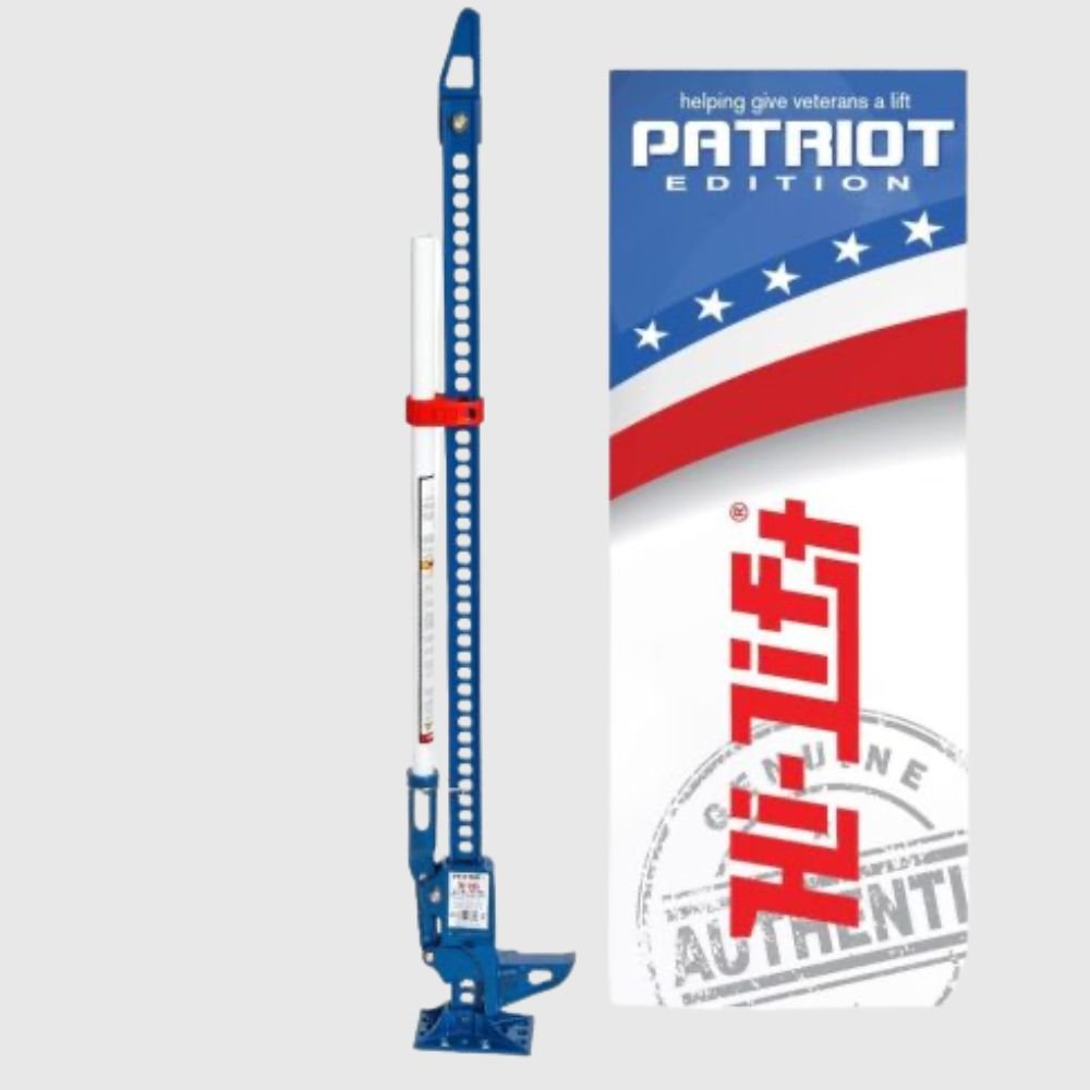 El gato Hi-Lift Patriot Edition es un gato totalmente de fundición construido con componentes de hierro fundido para una máxima resistencia y durabilidad. Cuenta con un acabado con recubrimiento de polvo azul con herrajes galvanizados, manija y zócalo de dos piezas con recubrimiento de polvo blanco duradero y Handle-Keeper rojo.